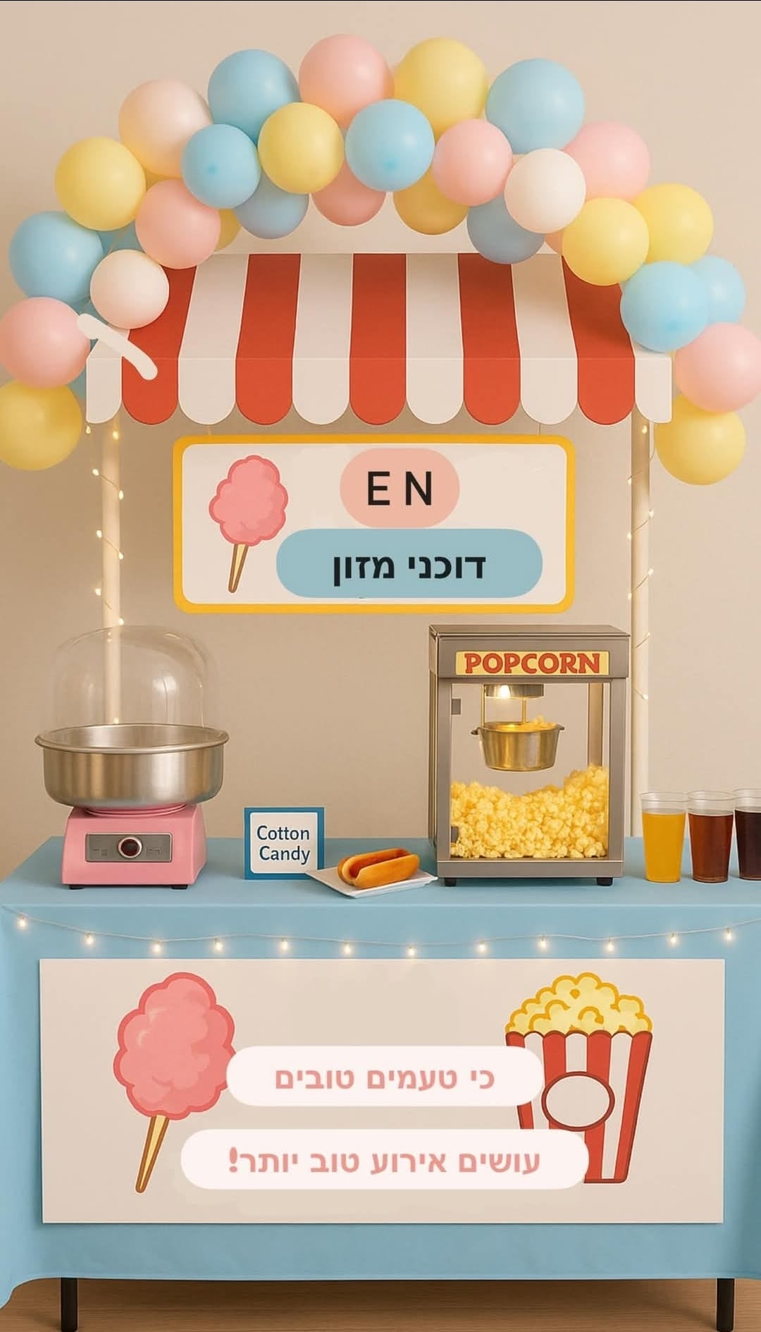 שערות סבתא | פופקורן | שולחן שוק | קעקועי דמויות | גנרטורים | שקיות הפתעה | שולחן פירות וארטיקים| נקניקיות | שתייה קלה | השכרת מכונות וציוד וכל מה שתחלמו עליו, במקום אחד!